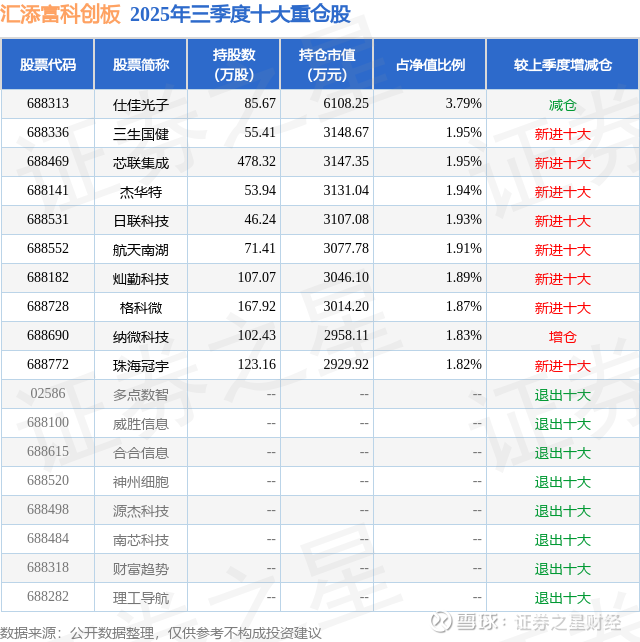 汇添富科创板的前十大重仓股如下: