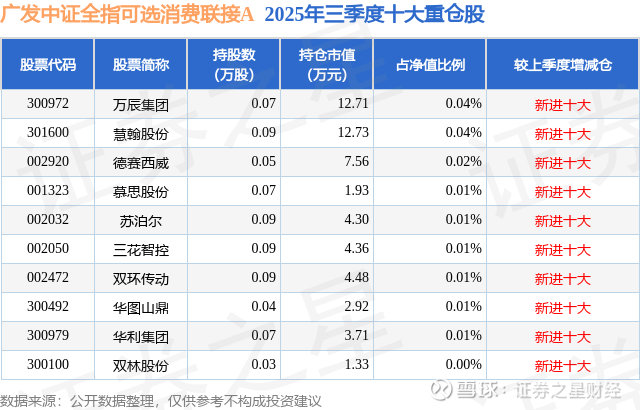 根据2025基金Q3季报公募基金重仓股数据,重仓该股的公募基金共1家,其中持有数量最多的公募基金为广发基金的广发中证全指可选消费联接A。广发中证全指可选消费联接A目前规模为1.69亿元,最新净值1.1364(1月12日),较上一交易日上涨0.45%,近一年上涨17.0%。该公募基金现任基金经理为姚曦。姚曦在任的基金产品包括:广发中证主要消费ETF,管理时间为2022年10月19日至今,期间收益率为-12.38%;广发中证全指原材料ETF,管理时间为2022年11月15日至今,期间收益率为48.42%;广发中证全指能源ETF,管理时间为2022年11月15日至今,期间收益率为23.47%;广发中证稀有金属主题ETF,管理时间为2023年1月10日至今,期间收益率为48.51%。