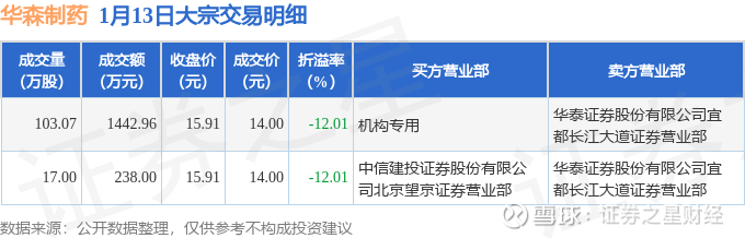 证券之星消息,1月13日华森制药发生大宗交易,交易数据如下: