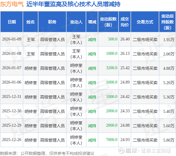 东方电气近半年内的董监高及核心技术人员增减持详情如下: