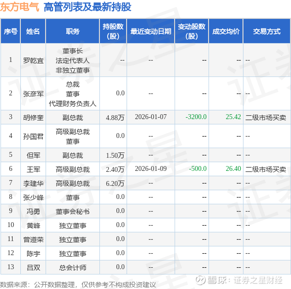 东方电气的高管列表及最新持股情况如下: