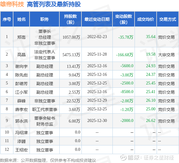 雄帝科技的高管列表及最新持股情况如下: