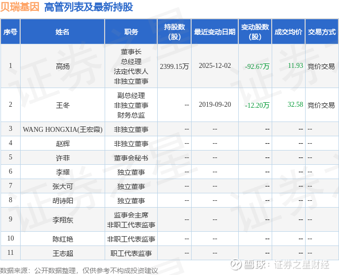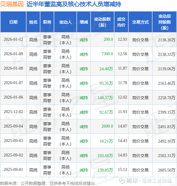 贝瑞基因近半年内的董监高及核心技术人员增减持详情如下: