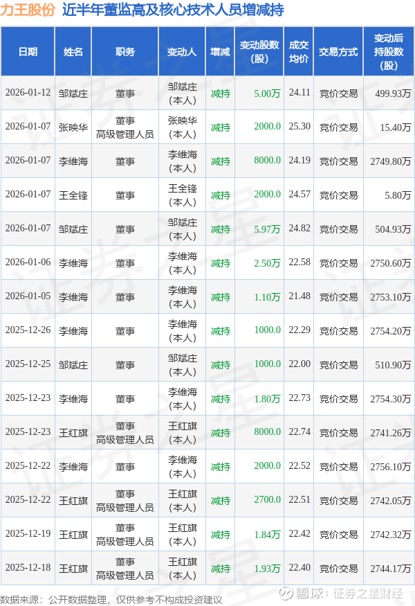 力王股份近半年内的董监高及核心技术人员增减持详情如下: