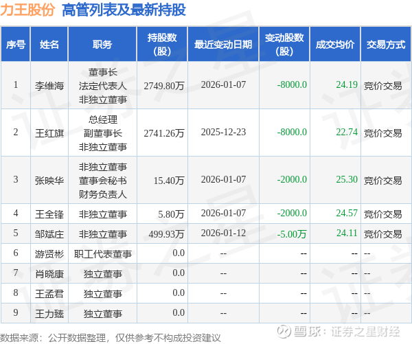力王股份的高管列表及最新持股情况如下:
