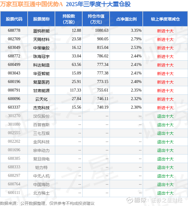 根据2025基金Q3季报公募基金重仓股数据,重仓该股的公募基金共4家,其中持有数量最多的公募基金为万家基金的万家互联互通中国优势A。万家互联互通中国优势A目前规模为2.94亿元,最新净值0.9812(1月13日),较上一交易日下跌2.77%,近一年上涨54.93%。该公募基金现任基金经理为尹航。尹航在任的基金产品包括:万家量化同顺多策略混合A,管理时间为2020年7月21日至今,期间收益率为23.94%;万家互联互通核心资产量化A,管理时间为2021年3月25日至今,期间收益率为14.86%;万家红利量化选股混合发起式A,管理时间为2023年11月15日至今,期间收益率为4.52%。