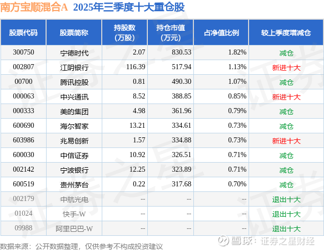 南方宝顺混合A的前十大重仓股如下: