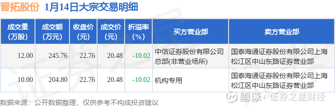 证券之星消息,1月14日晋拓股份发生大宗交易,交易数据如下: