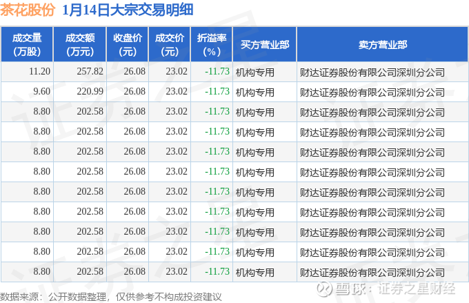 证券之星消息,1月14日茶花股份发生大宗交易,交易数据如下: