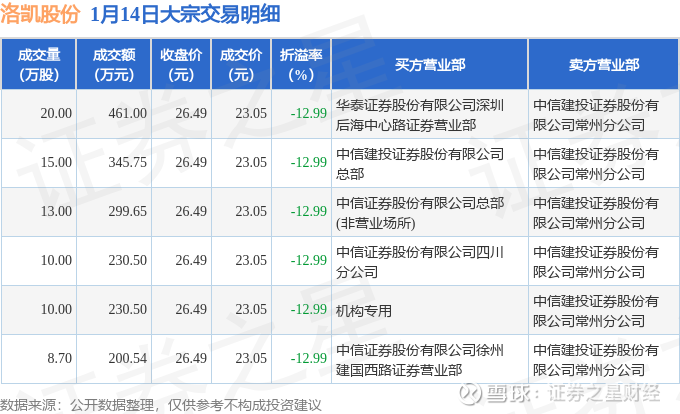 证券之星消息,1月14日洛凯股份发生大宗交易,交易数据如下: