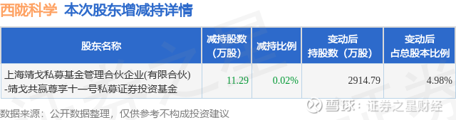 证券之星消息,1月14日西陇科学发布公告《西陇科学:关于持股5%以上股东减持计划实施完成的公告》,其股东上海靖戈私募基金管理合伙企业(有限合伙)-靖戈共赢尊享十一号私募证券投资基金于2026年1月8日至2026年1月14日间合计减持11.29万股,占公司目前总股本的0.0193%,变动期间该股股价下跌1.69%,截止1月14日收盘报9.29元。