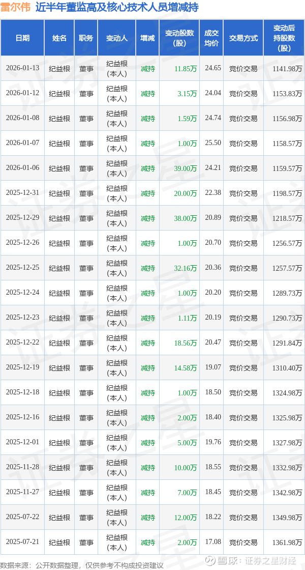雷尔伟近半年内的董监高及核心技术人员增减持详情如下: