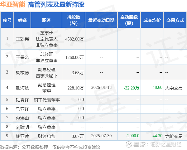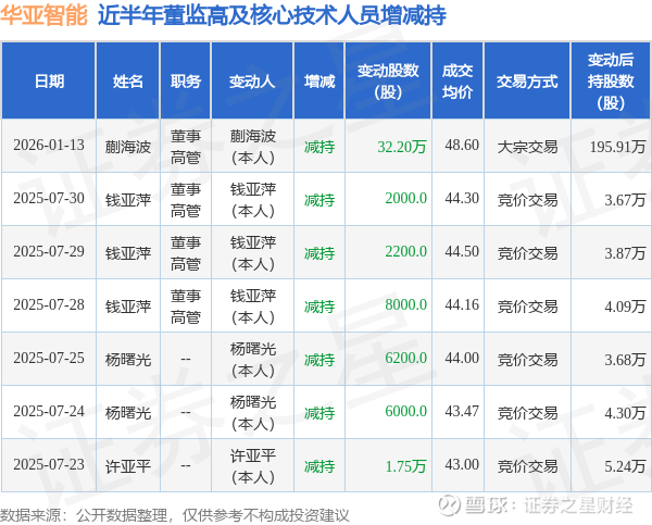 华亚智能近半年内的董监高及核心技术人员增减持详情如下: