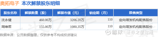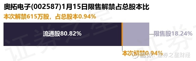 证券之星消息,根据市场公开信息整理,奥拓电子(002587)于1月15日将有615.0万股限售股份解禁,为公司定向增发机构配售股份,占公司总股本0.94%。(本次数据根据历史公告整理得出,实际情况以上市公司最新公告为准)本次解禁后,公司还有1.19亿股限售股份,占总股本18.24%。具体如下图所示: