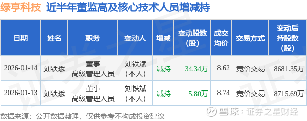 证券之星消息,根据1月15日市场公开信息、上市公司公告及交易所披露数据整理,绿亨科技(920866)最新董监高及相关人员股份变动情况:2026年1月14日公司董事,高级管理人员刘铁斌共减持公司股份34.34万股,占公司总股本为0.1906%。变动期间公司股价上涨0.93%,1月14日当日收盘报8.65元。
