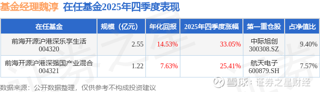 重仓股调仓示例详解:1、茂莱光学(688502)翻倍案例:魏淳管理的前海开源高端装备制造混合A基金在24年2季度买入茂莱光学,已连续持有1年又2个季度。持有期间的估算收益率为261.46%,持有期间茂莱光学在2024年到2025年的中报归属净利润增幅达110.36%。2、北方华创(002371)调仓案例:魏淳管理的前海开源高端装备制造混合A基金在24年1季度买入北方华创,在持有1年又2个季度后在25年3季度卖出。持有期间的估算收益率为83.17%,持有期间北方华创在2024年到2025年的中报营业总收入增幅达29.51%。3、歌尔股份(002241)折戟案例:魏淳管理的前海开源人工智能主题混合A基金在21年4季度买入歌尔股份,在持有1年又0个季度后在22年4季度卖出。持有期间的估算收益率为-57.33%,持有期间歌尔股份在2021年到2022年的年报营业总收入增幅达34.1%。