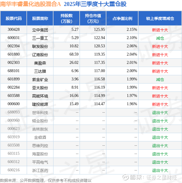 根据2025基金Q3季报公募基金重仓股数据,重仓该股的公募基金共2家,其中持有数量最多的公募基金为南华基金的南华丰睿量化选股混合A。南华丰睿量化选股混合A目前规模为0.12亿元,最新净值1.2477(1月14日),较上一交易日下跌0.49%,近一年上涨24.21%。该公募基金现任基金经理为黄志钢。黄志钢在任的基金产品包括:南华丰汇混合A,管理时间为2022年3月5日至今,期间收益率为104.0%;南华丰元量化选股混合A,管理时间为2024年1月23日至今,期间收益率为46.48%;南华丰利量化选股混合A,管理时间为2025年3月7日至今,期间收益率为14.34%。