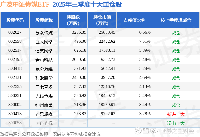 根据2025基金Q3季报公募基金重仓股数据,重仓该股的公募基金共7家,其中持有数量最多的公募基金为广发基金的广发中证传媒ETF。广发中证传媒ETF目前规模为29.84亿元,最新净值1.3114(1月14日),较上一交易日上涨2.48%,近一年上涨74.27%。该公募基金现任基金经理为罗国庆。罗国庆在任的基金产品包括:广发中证传媒ETF联接A,管理时间为2018年1月2日至今,期间收益率为25.83%;广发中证A100ETF联接A,管理时间为2019年5月27日至今,期间收益率为41.53%;广发中证创新药产业ETF,管理时间为2020年12月3日至今,期间收益率为-31.92%。