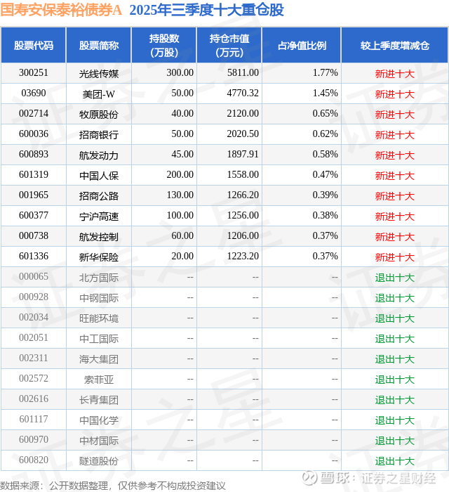 国寿安保泰裕债券A的前十大重仓股如下: