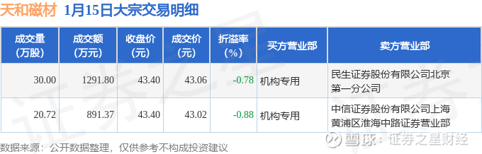 证券之星消息,1月15日天和磁材发生大宗交易,交易数据如下: