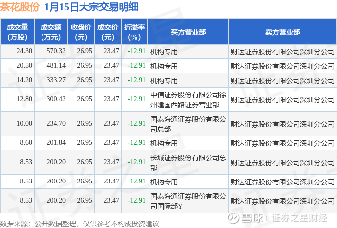 证券之星消息,1月15日茶花股份发生大宗交易,交易数据如下: