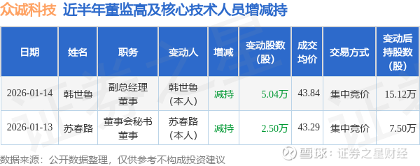 众诚科技近半年内的董监高及核心技术人员增减持详情如下: