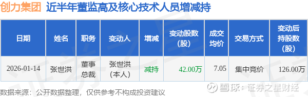 证券之星消息,根据1月15日市场公开信息、上市公司公告及交易所披露数据整理,创力集团(603012)最新董监高及相关人员股份变动情况:2026年1月14日公司董事,总裁张世洪共减持公司股份42.0万股,占公司总股本为0.065%。变动期间公司股价上涨1.56%,1月14日当日收盘报7.14元。