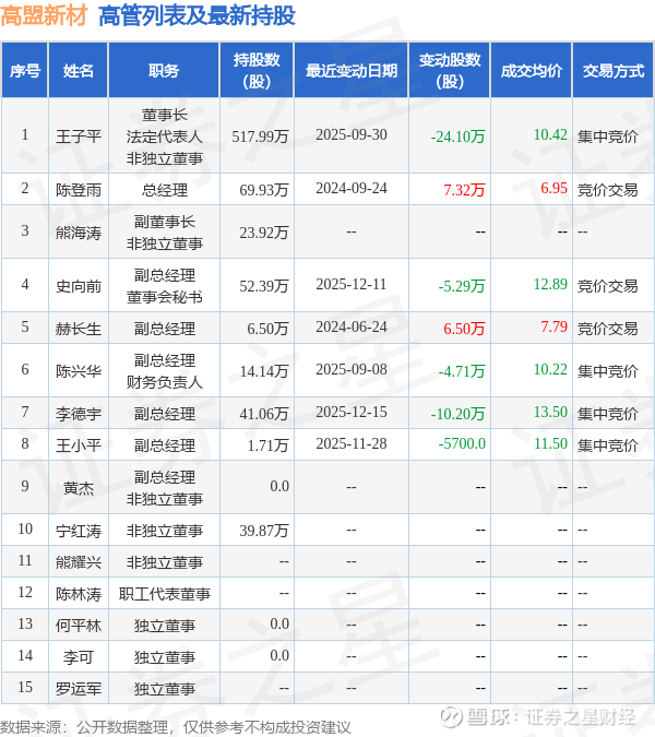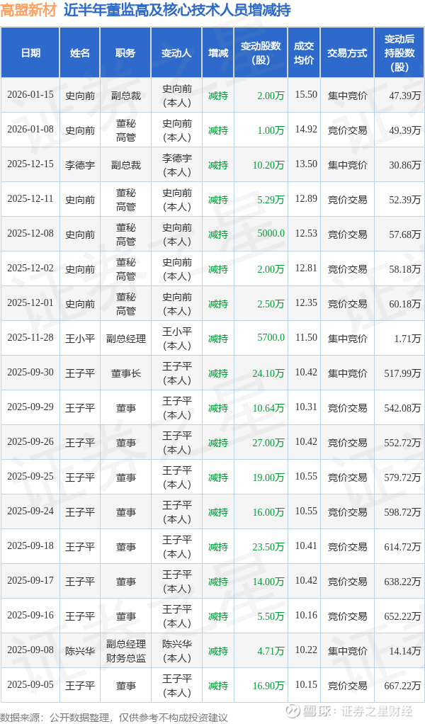 高盟新材近半年内的董监高及核心技术人员增减持详情如下: