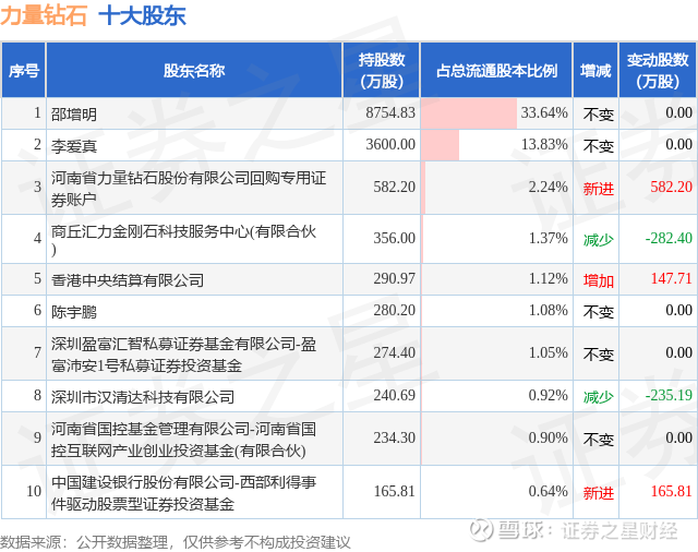 根据力量钻石2025年三季报公布的十大股东详情如下: