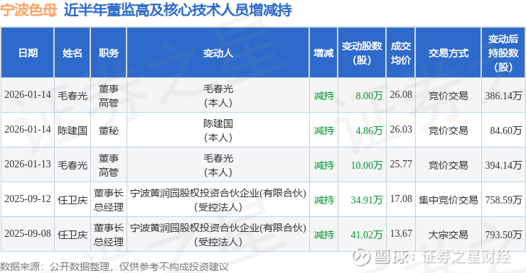 宁波色母近半年内的董监高及核心技术人员增减持详情如下: