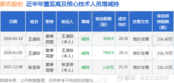 证券之星消息,根据1月15日市场公开信息、上市公司公告及交易所披露数据整理,新农股份(002942)最新董监高及相关人员股份变动情况:2026年1月14日公司董事,高管王湛钦共减持公司股份3000.0股,占公司总股本为0.0019%。变动期间公司股价上涨0.88%,1月14日当日收盘报20.56元。