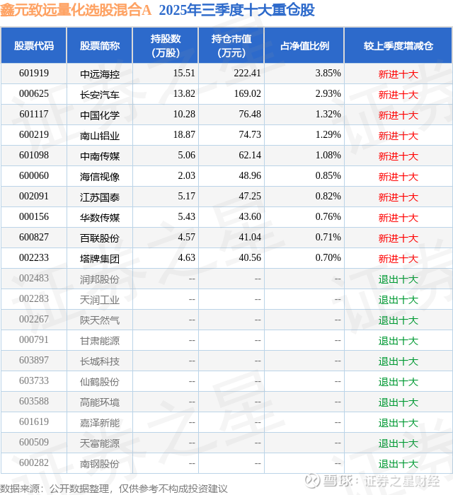 根据2025基金Q3季报公募基金重仓股数据,重仓该股的公募基金共1家,其中持有数量最多的公募基金为鑫元基金的鑫元致远量化选股混合A。鑫元致远量化选股混合A目前规模为0.3亿元,最新净值1.1763(1月15日),较上一交易日下跌0.15%,近一年上涨17.63%。该公募基金现任基金经理为刘宇涛 肖涵。刘宇涛在任的基金产品包括:鑫元鑫趋势灵活配置混合A,管理时间为2022年9月20日至今,期间收益率为26.85%;鑫元中证1000指数增强发起式A,管理时间为2022年11月28日至今,期间收益率为44.5%;鑫元国证2000指数增强A,管理时间为2023年8月10日至今,期间收益率为51.27%;鑫元浩鑫增强债券A,管理时间为2023年11月2日至今,期间收益率为6.97%。肖涵在任的基金产品包括:鑫元华证沪深港红利50指数A,管理时间为2025年12月10日至今,期间收益率为1.14%;鑫元中证A100指数A,管理时间为2025年12月10日至今,期间收益率为3.74%;鑫元上证科创板综合价格指数增强A,管理时间为2025年12月10日至今,期间收益率为12.16%。
