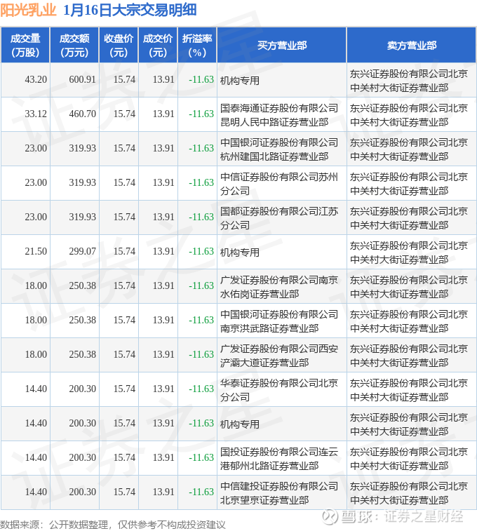 证券之星消息,1月16日阳光乳业发生大宗交易,交易数据如下: