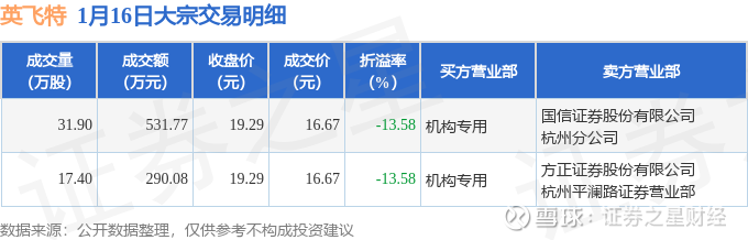 证券之星消息,1月16日英飞特发生大宗交易,交易数据如下: