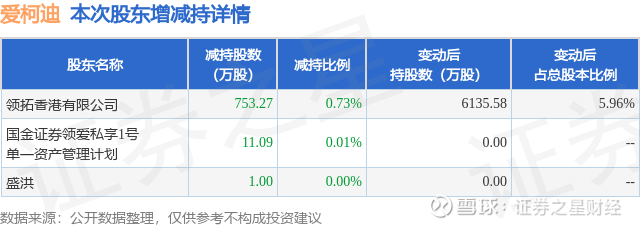 证券之星消息,1月16日爱柯迪发布公告《爱柯迪:关于持股5%以上股东权益变动触及1%刻度的提示性公告》,其股东领拓香港有限公司、国金证券领爱私享1号单一资产管理计划、盛洪于2026年1月15日至2026年1月16日间合计减持765.36万股,占公司目前总股本的0.743%,变动期间该股股价上涨3.68%,截止1月16日收盘报20.29元。