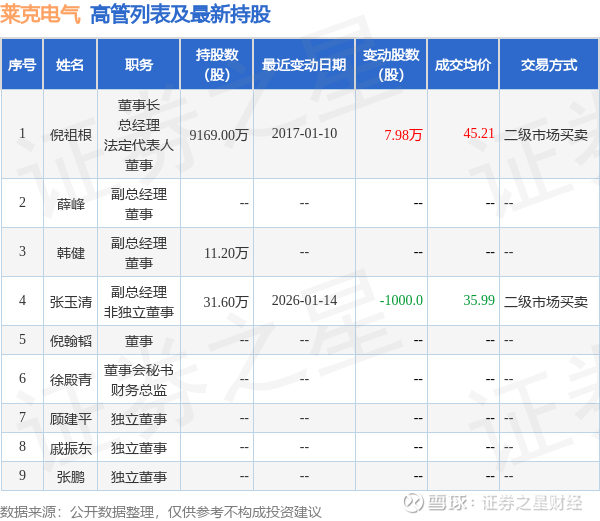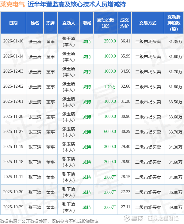 莱克电气近半年内的董监高及核心技术人员增减持详情如下: