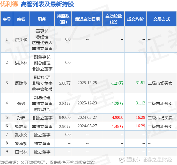 优利德近半年内的董监高及核心技术人员增减持详情如下: