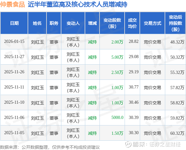 仲景食品近半年内的董监高及核心技术人员增减持详情如下: