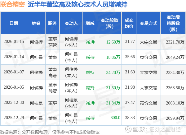 联合精密近半年内的董监高及核心技术人员增减持详情如下: