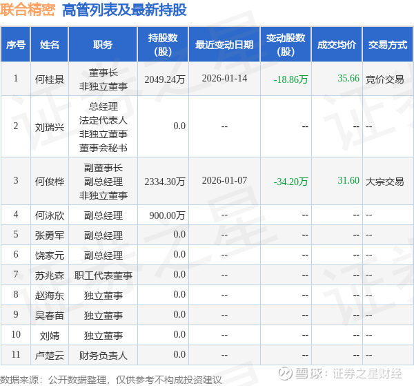 联合精密的高管列表及最新持股情况如下: