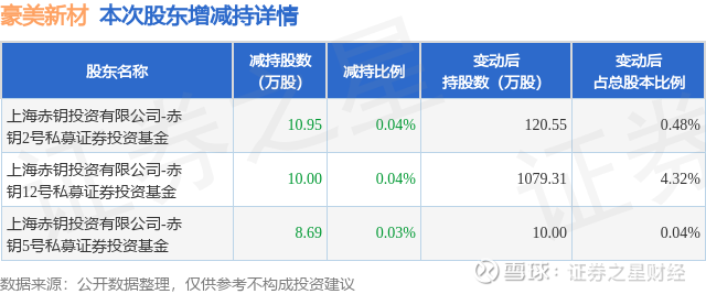 证券之星消息,1月18日豪美新材发布公告《豪美新材:关于持股5%以上股东减持计划实施完毕的公告》,其股东上海赤钥投资有限公司-赤钥2号私募证券投资基金、上海赤钥投资有限公司-赤钥12号私募证券投资基金、上海赤钥投资有限公司-赤钥5号私募证券投资基金于2026年1月8日至2026年1月16日间合计减持29.64万股,占公司目前总股本的0.1186%,变动期间该股股价上涨1.69%,截止1月16日收盘报39.74元。