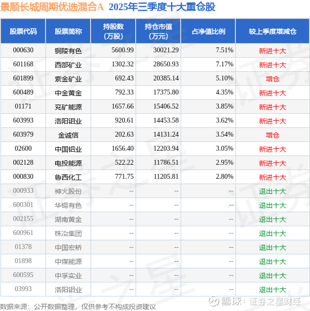 根据2025基金Q3季报公募基金重仓股数据,重仓该股的公募基金共35家,其中持有数量最多的公募基金为景顺长城基金的景顺长城周期优选混合A。景顺长城周期优选混合A目前规模为12.16亿元,最新净值2.024(1月16日),较上一交易日下跌0.83%,近一年上涨74.03%。该公募基金现任基金经理为邹立虎。邹立虎在任的基金产品包括:景顺长城安盈回报一年持有混合A,管理时间为2021年11月16日至今,期间收益率为53.01%;景顺长城景盛双息收益债券A,管理时间为2022年1月29日至今,期间收益率为25.49%;景顺景颐招利6个月持有期债券A,管理时间为2022年3月12日至今,期间收益率为29.46%;景顺长城华城稳健6个月持有期混合A,管理时间为2022年3月12日至今,期间收益率为33.28%。