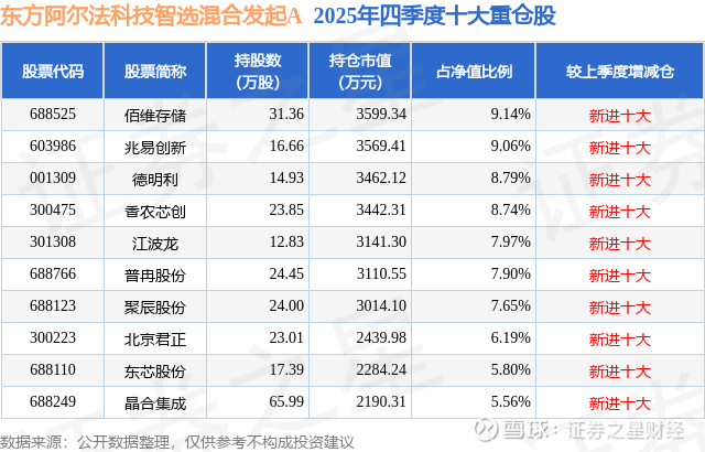 根据2025基金年报公募基金重仓股数据,重仓该股的公募基金共1家,其中持有数量最多的公募基金为东方阿尔法基金的东方阿尔法科技智选混合发起A。东方阿尔法科技智选混合发起A目前规模为0.18亿元,最新净值1.3428(1月16日),较上一交易日上涨8.34%。该公募基金现任基金经理为梁少文。梁少文在任的基金产品包括:东方阿尔法科技优选混合发起A,管理时间为2025年12月1日至今,期间收益率为30.74%;