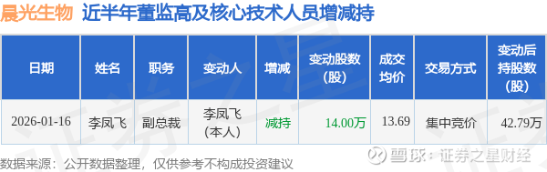 证券之星消息,根据1月19日市场公开信息、上市公司公告及交易所披露数据整理,晨光生物(300138)最新董监高及相关人员股份变动情况:2026年1月16日公司副总裁李凤飞共减持公司股份14.0万股,占公司总股本为0.029%。变动期间公司股价上涨1.04%,1月16日当日收盘报13.62元。