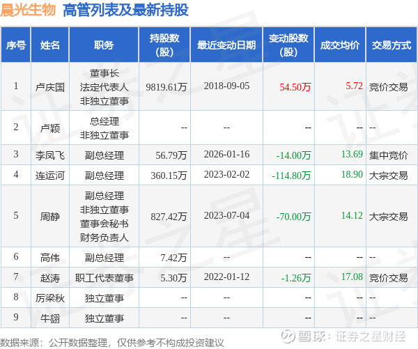 晨光生物的高管列表及最新持股情况如下: