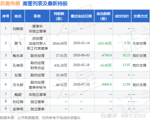 苏奥传感的高管列表及最新持股情况如下: