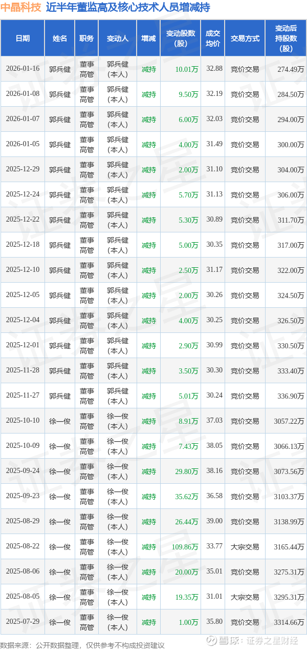 中晶科技近半年内的董监高及核心技术人员增减持详情如下: