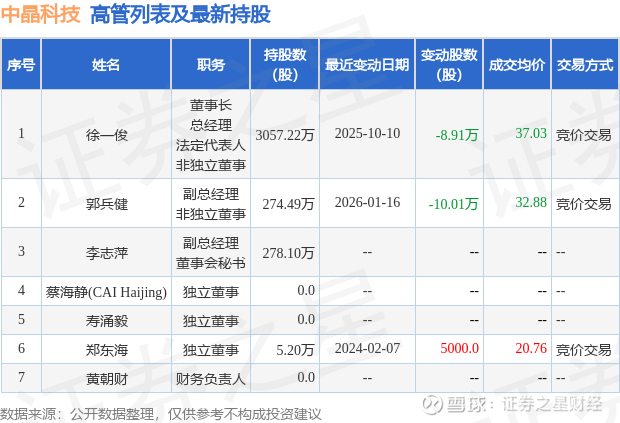 中晶科技的高管列表及最新持股情况如下: