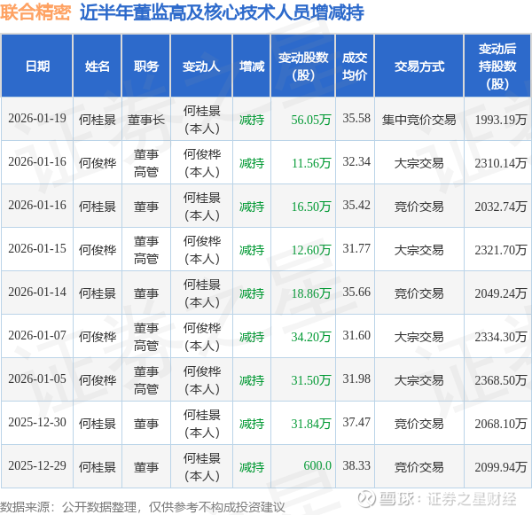 联合精密近半年内的董监高及核心技术人员增减持详情如下: