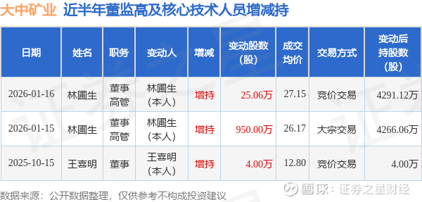 证券之星消息,根据1月19日市场公开信息、上市公司公告及交易所披露数据整理,大中矿业(001203)最新董监高及相关人员股份变动情况:2026年1月16日公司董事,高管林圃生共增持公司股份25.06万股,占公司总股本为0.0163%。变动期间公司股价下跌5.16%,1月16日当日收盘报27.2元。
